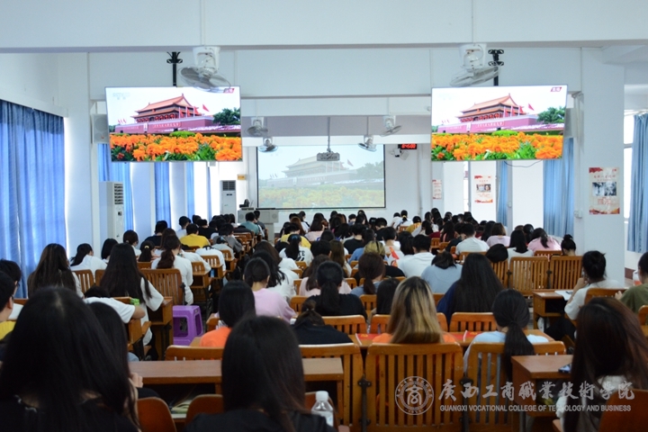 (學生代表在武鳴校區(qū)階梯教室觀看慶祝大會直播)