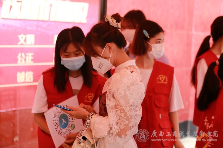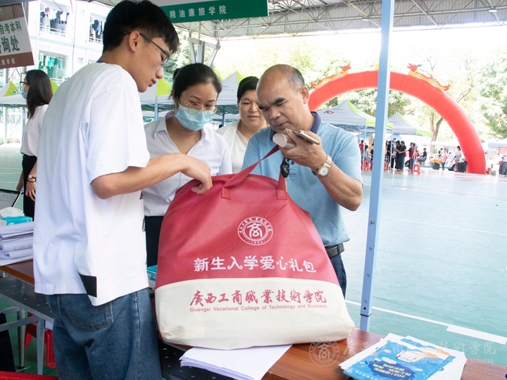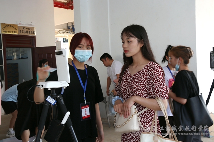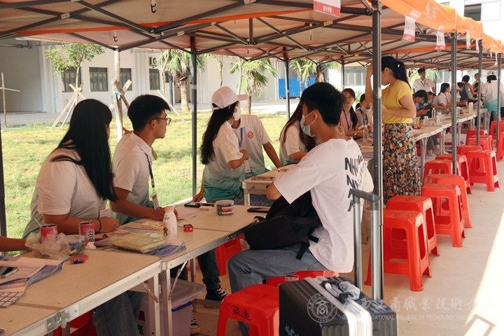 在校門口,新生根據(jù)報道流程,掃健康碼、消毒、測體溫后由校園志愿者接送到報到處。報到現(xiàn)場,各班班助有序地為新生做好報到登記、安排宿舍、飯卡發(fā)放等工作,耐心地為新生、家長答疑解惑。學(xué)生志愿者們?yōu)樾律_啟了“一站式迎新”服務(wù),從交驗材料、繳費注冊,到存放行李、核驗新生身份等每一個流程和環(huán)節(jié)都有學(xué)生志愿者們的熱情引導(dǎo),悉心服務(wù)。后勤部在各宿舍、路口等地方設(shè)工作點,保衛(wèi)師傅一手抓疫情防控、一手抓校園安保,同時進(jìn)行車流引導(dǎo)、協(xié)調(diào)校園交通,為迎新工作的有序進(jìn)行保駕護(hù)航。