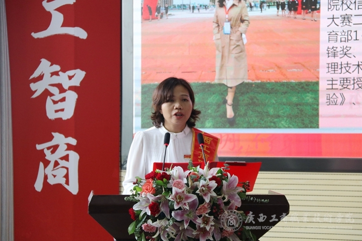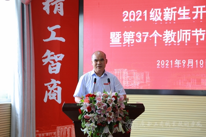最后,覃武云書記講話,他代表全院師生對六千余名2021級新生致以最熱烈的歡迎和最真誠的祝賀,歡迎新同學(xué)來到廣商院,作為新一代大學(xué)生,將個人理想與中華民族偉大復(fù)興的中國夢相結(jié)合,為建設(shè)壯美廣西、建設(shè)社會主義現(xiàn)代化強(qiáng)國做出自己的貢獻(xiàn)。他代表學(xué)院黨委及領(lǐng)導(dǎo)班子向默默耕耘在教育教學(xué)第一線的廣大教師致以節(jié)日的問候,希望新入職教師牢記使命、磨練本領(lǐng)、扎根教育事業(yè)不斷奉獻(xiàn),做好學(xué)生的引路人。