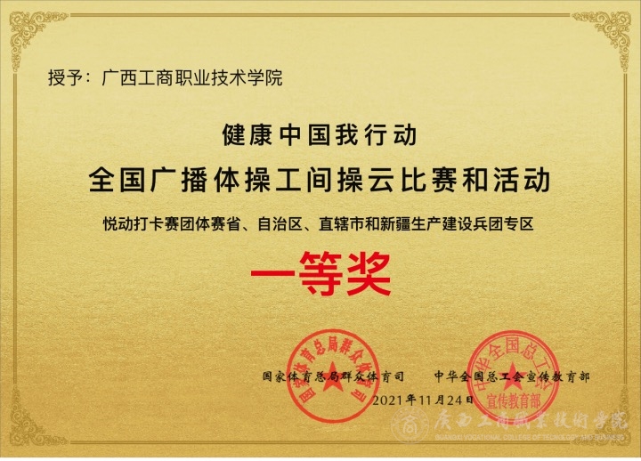 2021年1月28日起,由國(guó)家體育總局群眾體育司、中華全國(guó)總工會(huì)宣傳教育部主辦的“健康中國(guó)我行動(dòng)”全國(guó)廣播體操工間操云比賽和活動(dòng),在全國(guó)范圍熱烈開(kāi)展。學(xué)院以黨委副書(shū)記、工會(huì)主席率領(lǐng)的“廣商院之光”代表隊(duì),不畏艱難,堅(jiān)持不懈,斗志激昂、群策群力,“友誼第一,比賽第二”賽出成績(jī),賽出風(fēng)格,秉承“精工智商、明德修身”的校訓(xùn),蓬勃向上的精神面貌充分演繹了廣商院之美。在全國(guó)激烈的比賽競(jìng)爭(zhēng)中榮獲全國(guó)廣播體操工間操云比賽和活動(dòng)省、自治區(qū)、直轄市、新疆生產(chǎn)建設(shè)兵團(tuán)專(zhuān)區(qū)一等獎(jiǎng)、廣西賽區(qū)總成績(jī)第一名的好成績(jī)。運(yùn)動(dòng)員(排名不分先后):尹成功、羅素貞、劉倩、朱克敏、李燕、陳海燕、何麗瑩、李瑩、鄧詩(shī)瑤、李靜娟、覃曉穎、曾昭婷、黃曉曦、袁曉紅、梁麗郁、陸禮娟、謝容坤、韋慧、趙巍、陸長(zhǎng)英、曾方、鄧秋霞、嚴(yán)佳思23位老師榮獲全國(guó)廣播體操工間操云比賽和活動(dòng)悅動(dòng)打卡賽個(gè)人一等獎(jiǎng)、梁納獲得個(gè)人三等獎(jiǎng)。