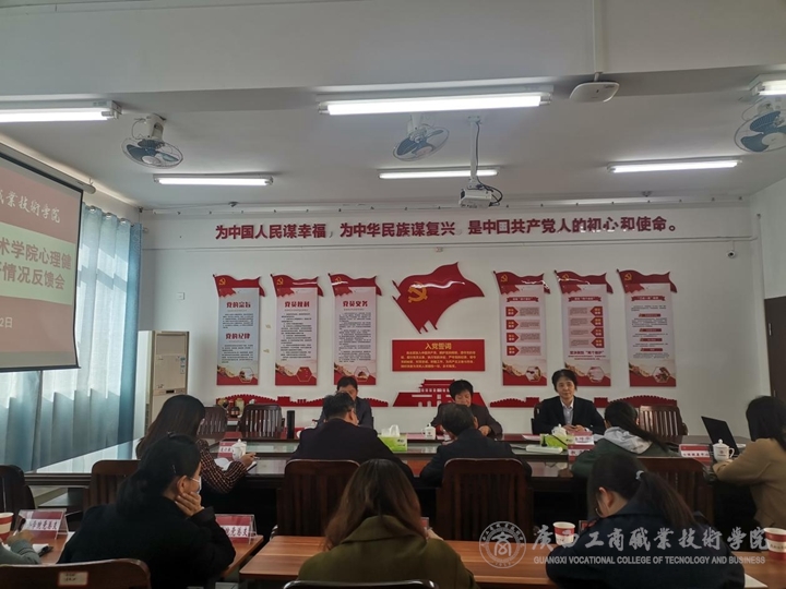 12月2日上午,受自治區(qū)教育廳委托,廣西中醫(yī)藥大學(xué)原副廳級(jí)調(diào)研員陳雪斌教授、廣西醫(yī)科大學(xué)唐崢華教授、桂林電子科技大學(xué)學(xué)工處副處長(zhǎng)張東華副教授到我院開展心理健康教育工作狀況調(diào)研。學(xué)院副院長(zhǎng)安仲文、黨委學(xué)生工作部部長(zhǎng)林雯、教務(wù)處及通識(shí)教育學(xué)院負(fù)責(zé)人、各二級(jí)學(xué)院黨總支書記、心理教育工作負(fù)責(zé)人、心理健康教育與咨詢中心(下稱心理中心)全體人員參與本次調(diào)研。