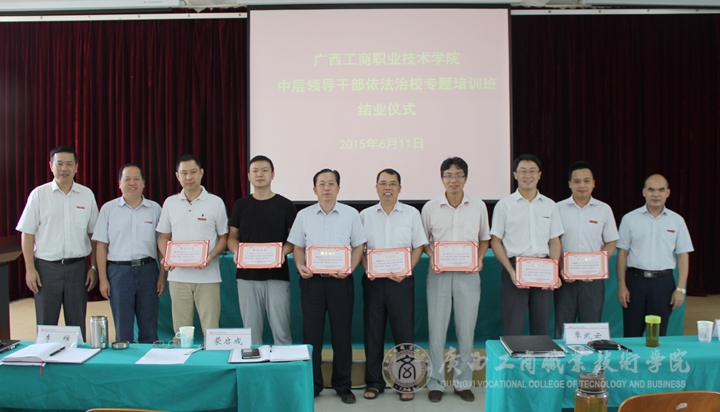 2015 年 6 月 11日下午,我院在校本部教學(xué)樓報(bào)告廳舉辦中層領(lǐng)導(dǎo)干部依法治校專題培訓(xùn)班結(jié)業(yè)儀式。學(xué)院領(lǐng)導(dǎo)覃武云、蒙啟成、李仕欽、李維出席,學(xué)院中層以上領(lǐng)導(dǎo)干部參加。儀式由蒙啟成副書記主持。