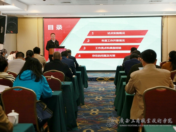 會議共有六項議程,一是由廣西1+X秘書處掛靠單位廣西工商職業(yè)技術(shù)學院黨委書記覃武云致歡迎詞,二是南寧職業(yè)技術(shù)學院、廣西交通職業(yè)技術(shù)學院、廣西工商職業(yè)技術(shù)學院、廣西玉林農(nóng)業(yè)學校、南寧第四職業(yè)技術(shù)學校等五家試點院校代表經(jīng)驗交流,三是培訓評價組織北京鴻科經(jīng)緯科技有限公司、北京中車行高新技術(shù)有限公司兩位代表經(jīng)驗分享,四是秘書長闕勇平作2021年1+X證書制度試點工作總結(jié),五是2021年多項重要成果發(fā)布,六是自治區(qū)教育廳覃壯才處長做工作部署。