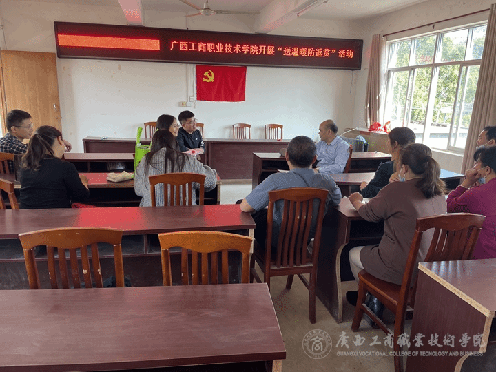 2021年12月15日,由學(xué)院黨委書記覃武云同志率隊,學(xué)校紀(jì)委書記韋云鳳、學(xué)院黨委組織部、經(jīng)貿(mào)學(xué)院以及上一任第一書記和工作隊員等代表一行8人組成慰問組,赴陸川縣馬坡鎮(zhèn)靖西村、珊羅鎮(zhèn)四樂村開展“送溫暖防返貧”活動,走訪慰問駐村黨支部第一書記、村干部、未解除風(fēng)險的監(jiān)測對象。