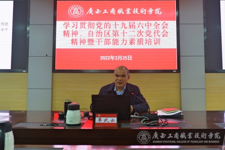 為深入學(xué)習(xí)貫徹黨的十九屆六中全會精神、自治區(qū)第十二次黨代會精神,進(jìn)一步加強(qiáng)中層管理干部黨性修養(yǎng),強(qiáng)化黨員教育管理,加快推進(jìn)學(xué)院教育事業(yè)發(fā)展,2022年2月25日上午,我院在鵬飛校區(qū)舉辦學(xué)習(xí)貫徹黨的十九屆六中全會精神、自治區(qū)第十二次黨代會精神暨干部能力素質(zhì)培訓(xùn)。學(xué)院領(lǐng)導(dǎo)、學(xué)院紀(jì)委委員、中層領(lǐng)導(dǎo)干部、各黨總支、各直屬黨支部書記、委員、組織員等參加此次培訓(xùn)。