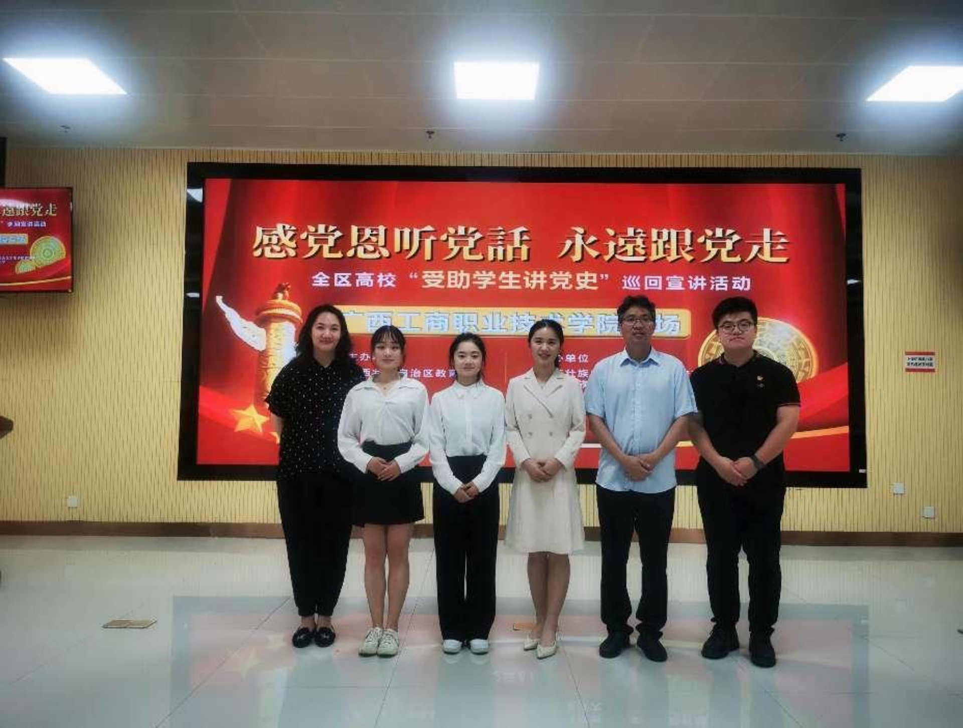 為深入學(xué)習(xí)貫徹習(xí)近平總書(shū)記在慶祝中國(guó)共產(chǎn)黨成立100周年大會(huì)上的重要講話精神,進(jìn)一步創(chuàng)新資助育人方式,深入推進(jìn)受助學(xué)生黨史學(xué)習(xí)教育不斷走深走實(shí),6月21日下午,“感黨恩聽(tīng)黨話 永遠(yuǎn)跟黨走”——2022年全區(qū)高?!笆苤鷮W(xué)生講黨史”巡回宣講活動(dòng)廣西工商職業(yè)技術(shù)學(xué)院專(zhuān)場(chǎng)在武鳴校區(qū)兩個(gè)會(huì)場(chǎng)同時(shí)舉行,自治區(qū)高?!笆苤鷮W(xué)生講黨史”宣講團(tuán)成員進(jìn)行了現(xiàn)場(chǎng)宣講。