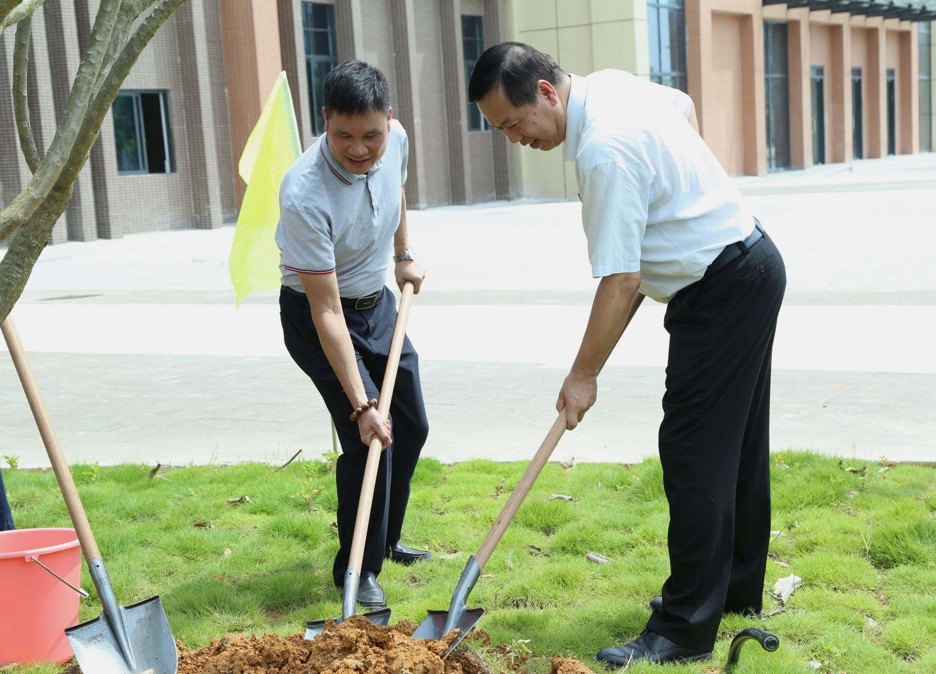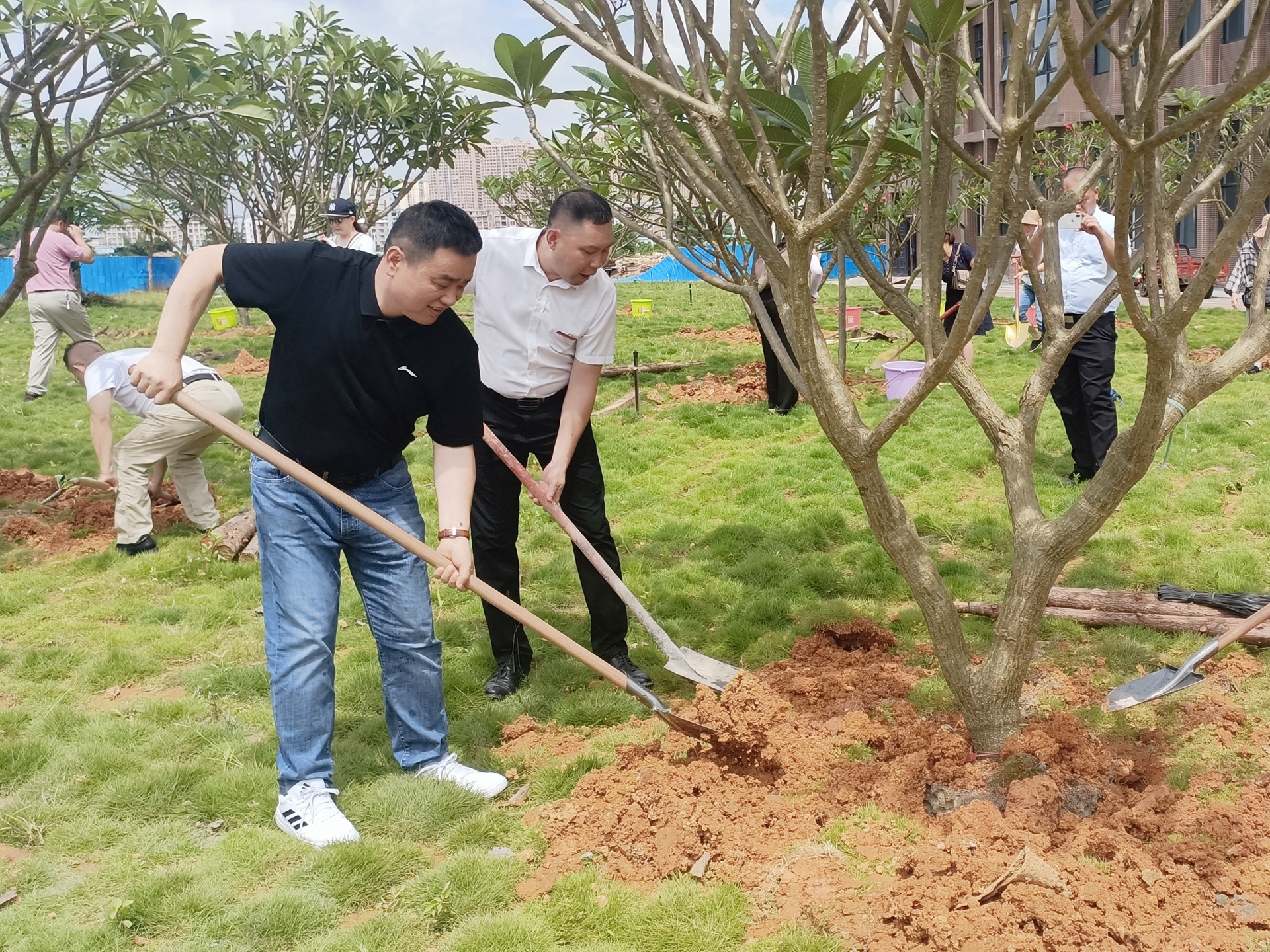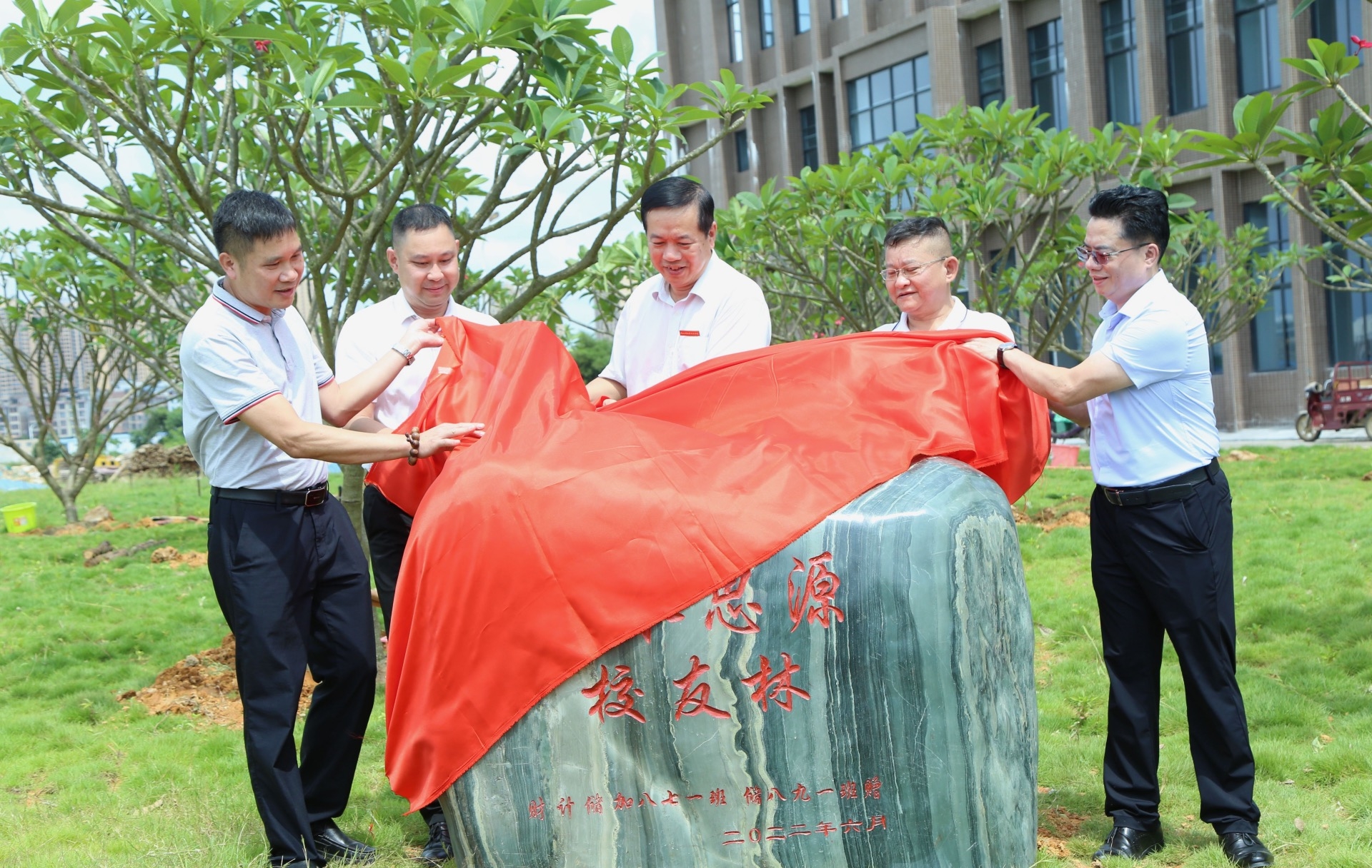 在歡快的氣氛中,學院領導和校友代表共同為校友林舉行了揭幕儀式,并一同為校友們捐贈的孕育希望的緬梔子樹苗培土澆水。