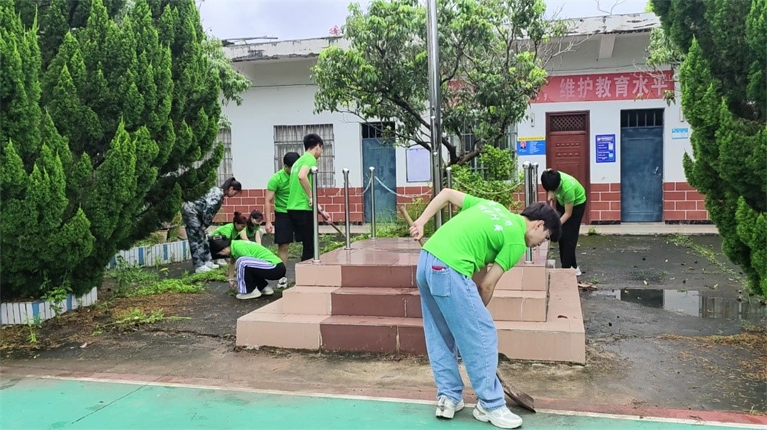 7月4日上午,服務隊師生走入橫州市巒城鎮(zhèn)安平小學下滕教學點。剛一進校,學生們認真清理了校園升旗臺和操場的雜草、青苔,打掃出一個干凈整潔的活動環(huán)境。