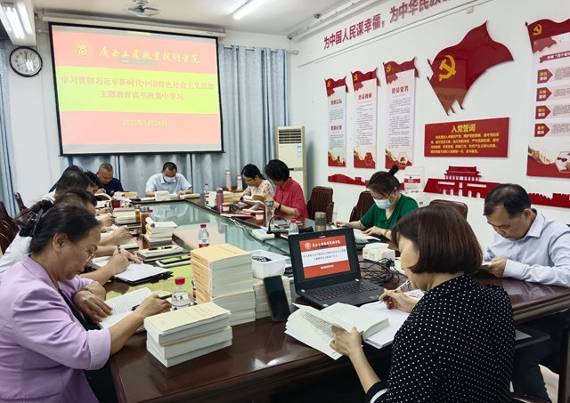 在鵬飛校區(qū)多個(gè)會(huì)議室和“紅灣”主題閱讀體驗(yàn)區(qū),同志們凝心靜氣,認(rèn)真研讀黨的二十大報(bào)告、中國(guó)共產(chǎn)黨章程、《習(xí)近平著作選讀》《習(xí)近平新時(shí)代中國(guó)特色社會(huì)主義思想專題摘編》等必讀書目和《習(xí)近平新時(shí)代中國(guó)特色社會(huì)主義思想學(xué)習(xí)綱要》等選讀書目,拓展學(xué)習(xí)習(xí)近平總書記在主題教育工作會(huì)議上的重要講話、習(xí)近平總書記對(duì)廣西“五個(gè)更大”重要要求等關(guān)于廣西地區(qū)和教育領(lǐng)域的特色材料。