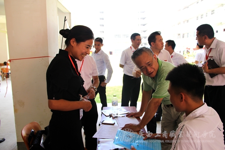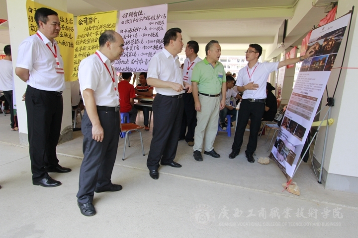 ??????? 2015年6月27日上午,廣西壯族自治區(qū)教育廳巡視員林寧蒞臨我院2015年畢業(yè)生供需見面洽談會暨頂崗實習企業(yè)推介會指導就業(yè)工作。我院黨委覃武云書記、陳杰院長、李維副院長等學院領導全程陪同參觀。