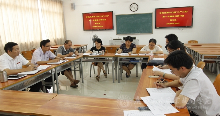 為了進一步加強學院黨員干部的思想道德建設,做好“三嚴三實”第一專題學習研討有關(guān)工作,我院中層以上領導干部在結(jié)束7月8日上午的“三嚴三實”第一專題集中學習研討后,于下午3點整,在教學樓分五組進行黨委理論學習中心組(擴大)學習會分組討論。