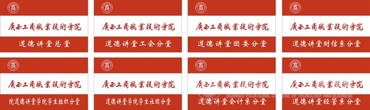 在道德講堂硬件布置上,我院突出 “以德育商”元素,體現(xiàn)商院特色,設(shè)計了專門的“道德講堂”統(tǒng)一LOGO標識、講堂背景板、道德箴言掛板及紀念品。并為道德講堂總堂、工會分堂、團委分堂、學院學生組織分堂、學院學生社團分堂和各系分堂制作了專門的“廣商育人紅”道德講堂旗幟。