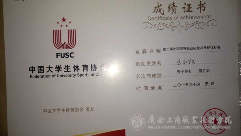 第二屆全國(guó)高等職業(yè)院校乒乓球錦標(biāo)賽于2015年7月20-23日在天津電子信息職業(yè)技術(shù)學(xué)院舉行。我院派出了由會(huì)計(jì)系稅會(huì)1432班王永權(quán)、會(huì)審1331班潘凌歡、會(huì)審1432班鄭琪雲(yún)、經(jīng)管系工商1434班黃瑞和、營(yíng)銷1331班趙海榮同學(xué)組成的學(xué)院代表隊(duì),赴天津參加了本次高職乒乓球盛會(huì)。我院代表隊(duì)在比賽中發(fā)揚(yáng)了良好的體育道德精神,互相鼓勵(lì),頑強(qiáng)拼搏,經(jīng)過(guò)4天激烈角逐,獲得了男子團(tuán)體第五名的驕人成績(jī),創(chuàng)造了我院參加全國(guó)體育比賽的最好名次。同時(shí),在有187名運(yùn)動(dòng)員所參加的男子單打比賽中,我院王永權(quán)同學(xué)憑著多變的戰(zhàn)術(shù),穩(wěn)定的心理,頑強(qiáng)的精神,兇狠的打法,連克強(qiáng)手,榮獲男子單打第五名。