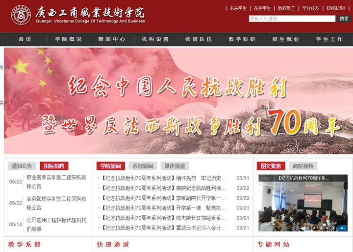 利用網(wǎng)絡(luò)平臺擴大紀念活動受眾。在學(xué)院網(wǎng)站主頁開設(shè)了紀念中國人民抗日戰(zhàn)爭勝利70周年“網(wǎng)上祭英烈”的網(wǎng)頁。并組織全校師生員工登錄學(xué)院網(wǎng)站主頁,向抗戰(zhàn)英烈鮮花留言,在網(wǎng)上高揚愛國主義主旋律,凝聚牢記歷史、圓夢中華的網(wǎng)上正能量。在學(xué)院主頁最顯著的頭圖位置更新主題為紀念中國人民抗日戰(zhàn)爭暨世界反法西斯戰(zhàn)爭勝利70周年圖片,在網(wǎng)絡(luò)平臺上營造濃厚的紀念氛圍。同時,利用微信、微博等新媒體推送紀念抗戰(zhàn)勝利70周年相關(guān)內(nèi)容,多渠道擴大紀念活動受眾。