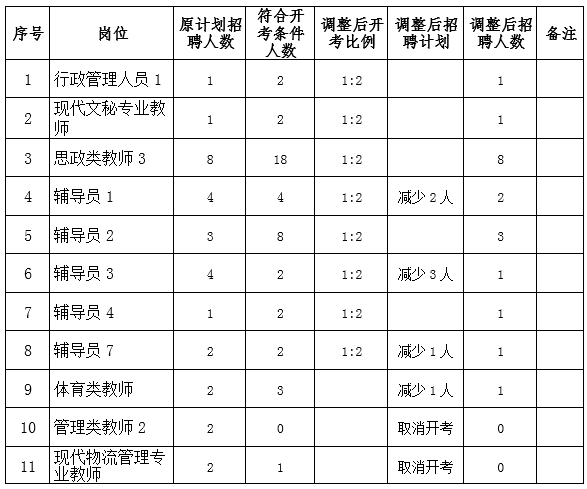 (六)輔導(dǎo)員3崗位開考比例調(diào)整為1:2,招聘人數(shù)由4人減少至1人。