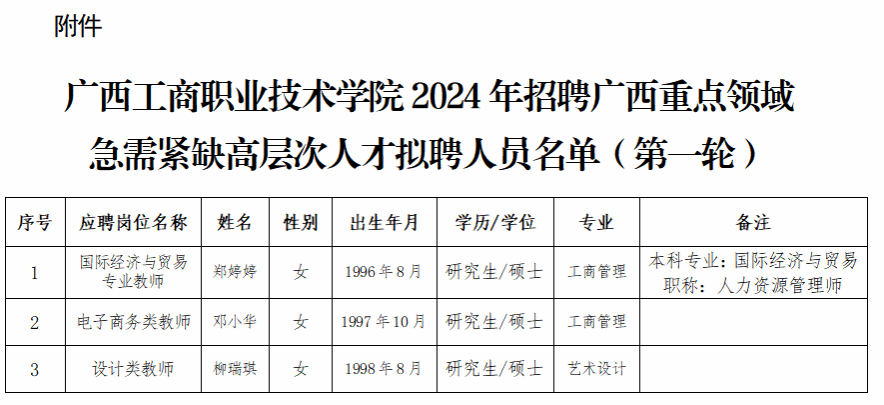 附件:廣西工商職業(yè)技術(shù)學院2024年廣西重點領(lǐng)域急需緊缺高層次人才招聘擬聘人員名單(第一輪)