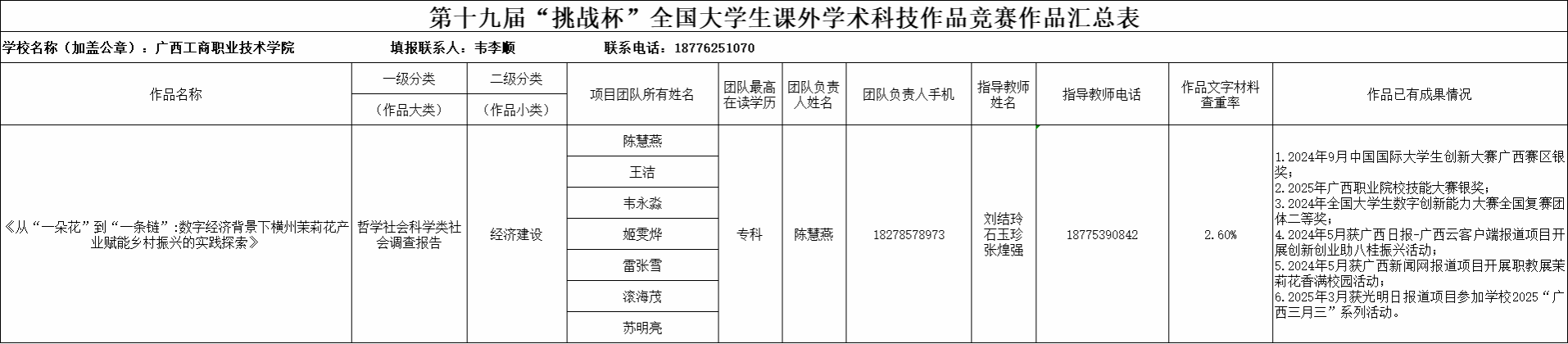 根據(jù)《關(guān)于組織開展第十九屆“挑戰(zhàn)杯”全國大學(xué)生課外學(xué)術(shù)科技作品競(jìng)賽的通知》精神,經(jīng)學(xué)生自主報(bào)名提交作品,共青團(tuán)廣西區(qū)委組織現(xiàn)場(chǎng)賽專家評(píng)審,擬推薦《從“一朵花”到“一條鏈”:數(shù)字經(jīng)濟(jì)背景下橫州茉莉花產(chǎn)業(yè)賦能鄉(xiāng)村振興的實(shí)踐探索》至全國組委會(huì)參加評(píng)審,現(xiàn)將名單公示,詳見附件。