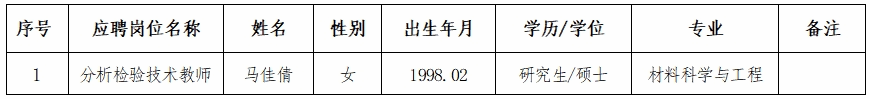 根據《廣西壯族自治區(qū)事業(yè)單位公開招聘人員實施辦法》(桂人社發(fā)〔2011〕155號)、《關于進一步規(guī)范區(qū)直事業(yè)單位公開招聘工作的通知》(桂人社辦發(fā)〔2013〕135號)、《關于進一步完善事業(yè)單位公開招聘工作的通知》(桂人社規(guī)〔2021〕7號)和《廣西工商職業(yè)技術學院2023年第二批公開招聘非實名人員控制數人員公告》相關規(guī)定,經公開招聘規(guī)定的程序,經研究,擬聘用馬佳倩同志到我院工作,現將擬聘人員名單(第三輪)予以公示,公示期為7日(2024年4月1日至2024年4月7日)。公示期內如對擬聘人員有異議,請以書面形式,并署真實姓名、聯系方式及聯系地址,于2024年4月7日18時前寄送到廣西工商職業(yè)技術學院人事處(直接送達以送達日期為準,郵寄以寄出郵戳為準)。地址:廣西南寧市鵬飛路15號廣西工商職業(yè)技術學院人事處(2212辦公室);聯系人:李老師、詹老師;郵編:530008;電話:0771-3160065。如實反映擬聘用人員的有關問題受法律保護。