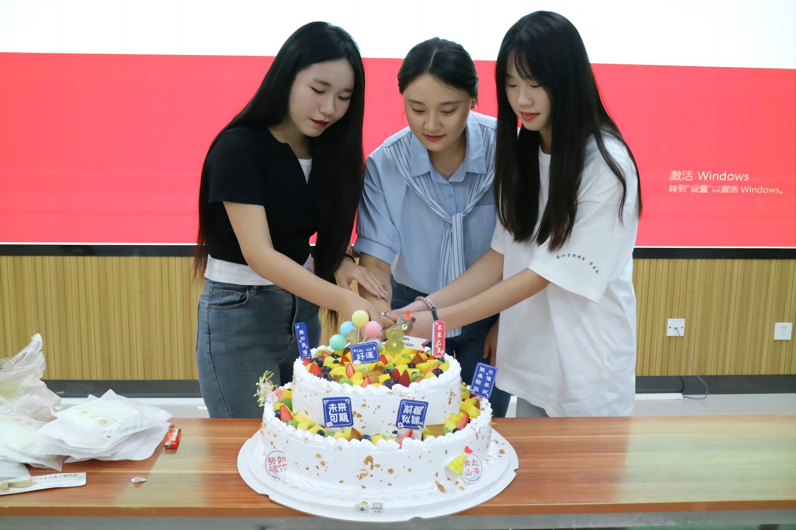 (圖為劉倩老師、22級執(zhí)行主席古蕓瑕和23級實習(xí)執(zhí)行主席李雪怡切蛋糕)