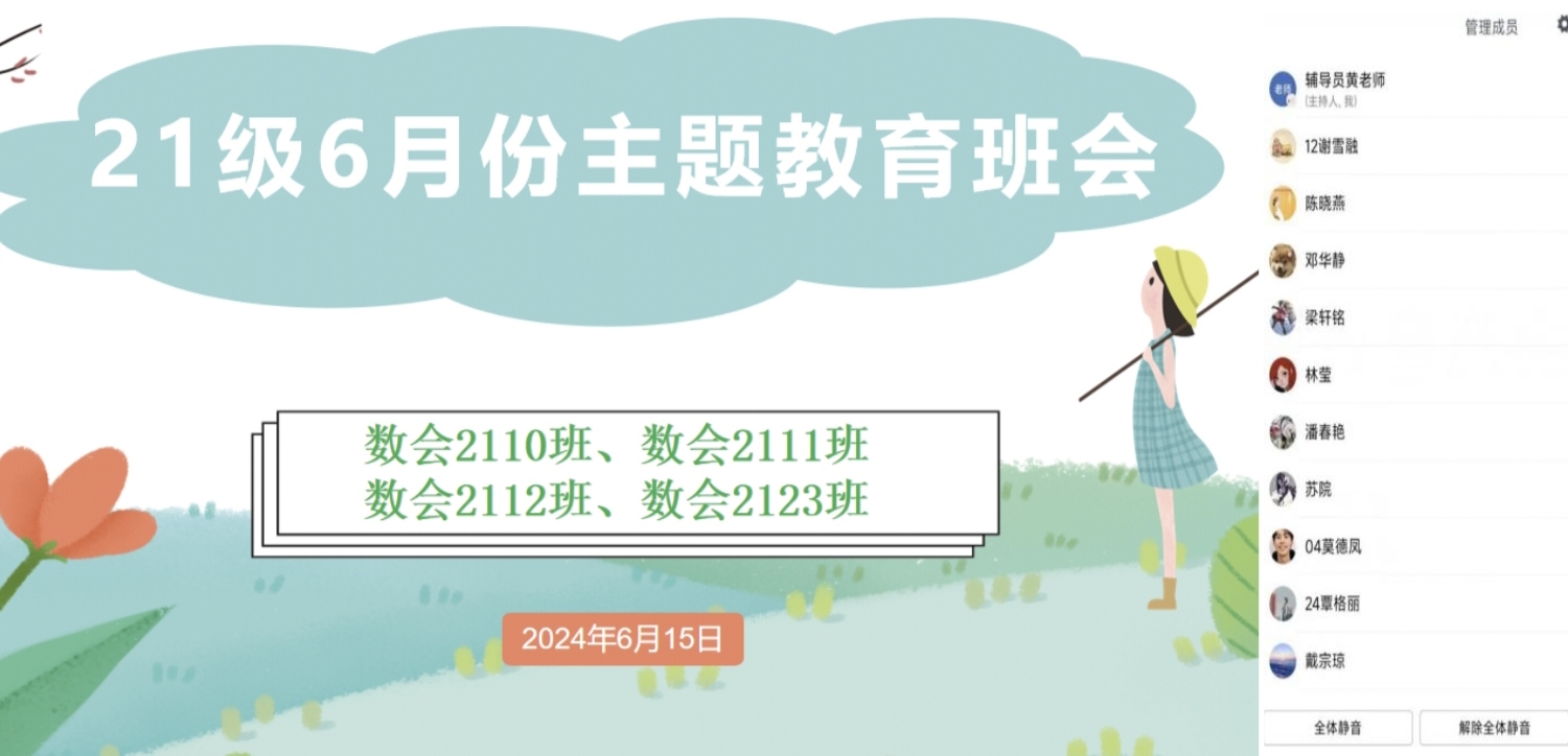 安全是生產(chǎn)的基礎(chǔ),是生活的前提。為持續(xù)推進(jìn)2024屆畢業(yè)生在校外期間各項(xiàng)工作安全有序進(jìn)行,數(shù)會2110班、數(shù)會2111班、數(shù)會2112班和數(shù)會2123班于2024年6月15日晚上通過騰訊會議線上召開六月份安全教育主題班會。