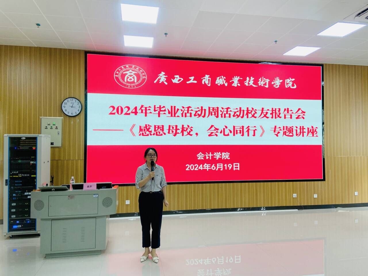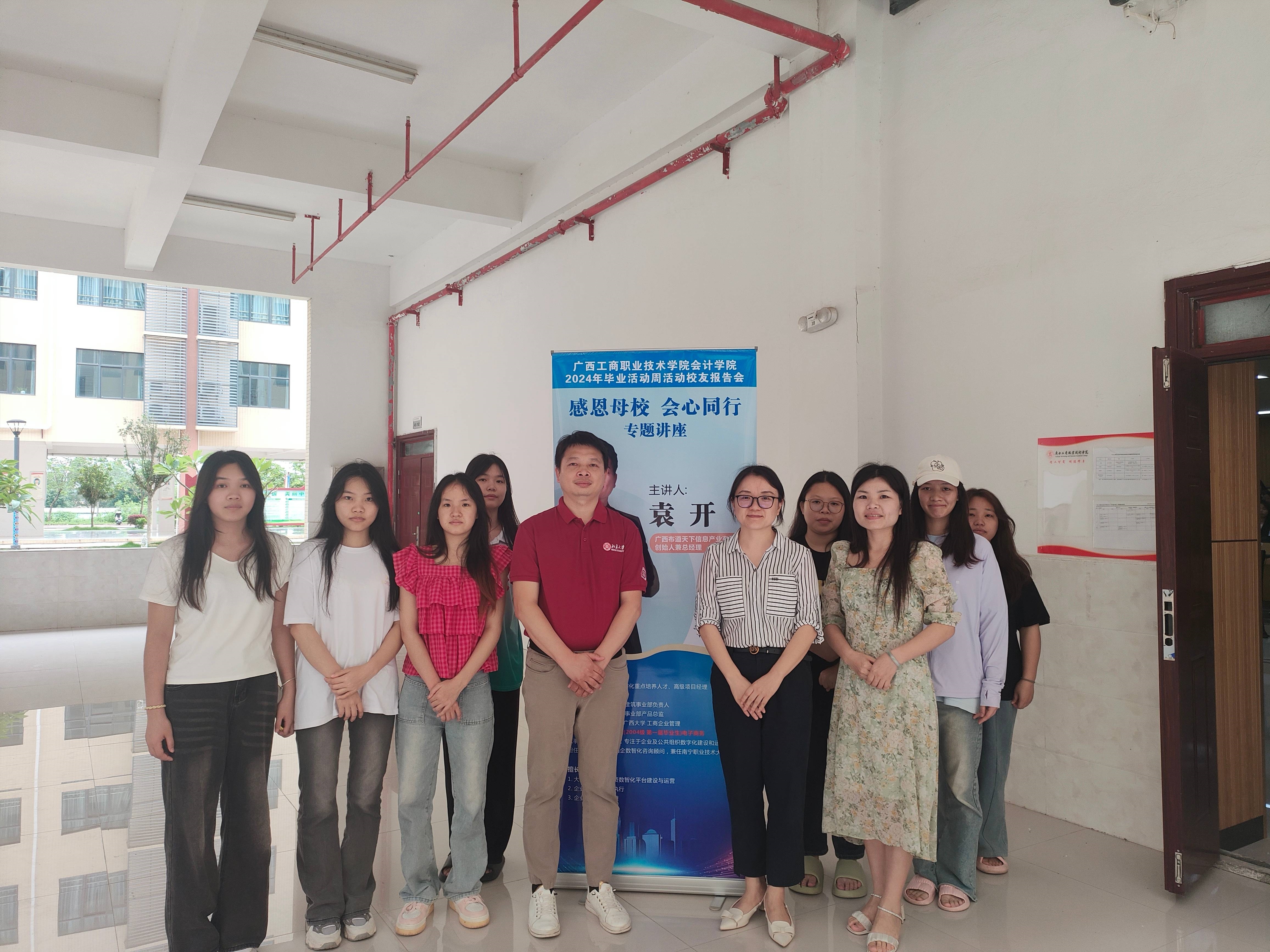 6月19日下午,會(huì)計(jì)學(xué)院2024年畢業(yè)活動(dòng)周活動(dòng)校友報(bào)告會(huì)——《感恩母校,會(huì)心同行》專題講座在A5-102階梯教室舉行。優(yōu)秀校友袁開同志(原2004級(jí)電子商務(wù)專業(yè)畢業(yè)生),現(xiàn)任廣西布道天下信息產(chǎn)業(yè)有限公司創(chuàng)始人兼總經(jīng)理受邀作為主講嘉賓從職場(chǎng)致勝、感恩母校及創(chuàng)業(yè)經(jīng)歷等方面為師生們帶來了一場(chǎng)的精彩講座。會(huì)計(jì)學(xué)院教師以及2022級(jí)全體學(xué)生參加會(huì)議,會(huì)議由會(huì)計(jì)學(xué)院副院長譚玉娥主持。