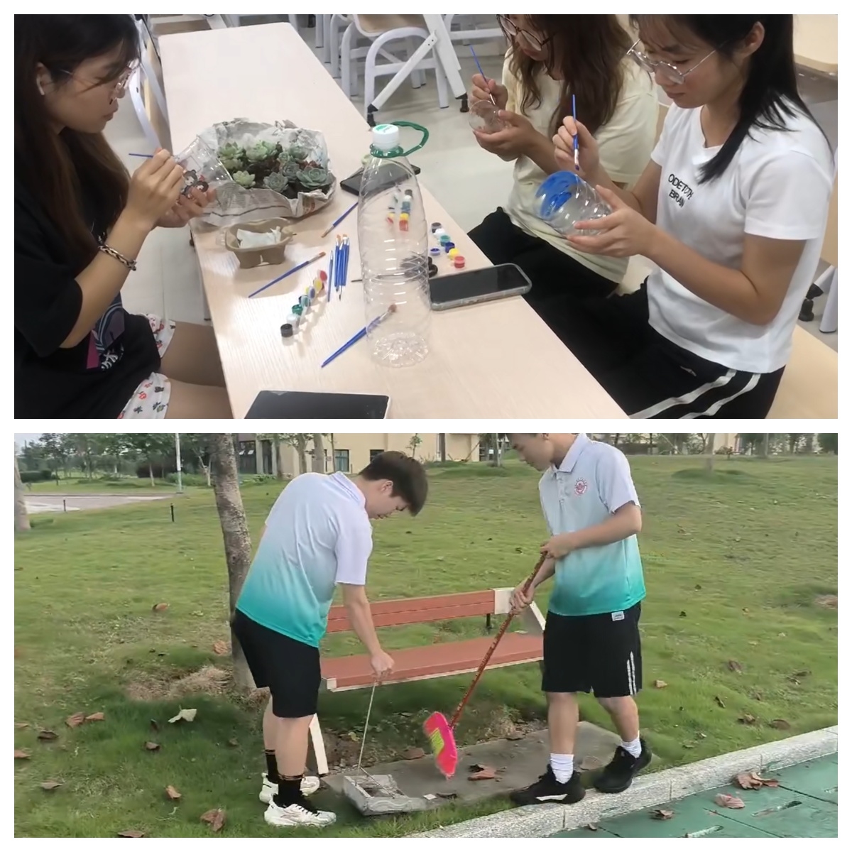 活動二是同學(xué)們利用平時所收集廢棄的塑料瓶、打包盒和快遞盒等可回收廢品,發(fā)揮能工巧手,制作不同的“陽光綠植”盆栽,爭奇斗艷的綠植也讓同學(xué)們心里充滿暖陽。除了盆栽,學(xué)生干部利用快遞包裝箱制作了垃圾分類箱,激發(fā)同學(xué)們更多的創(chuàng)作熱情。