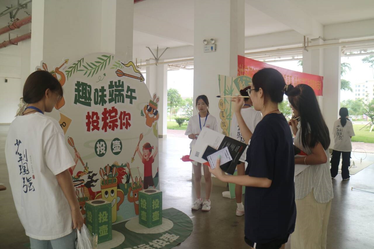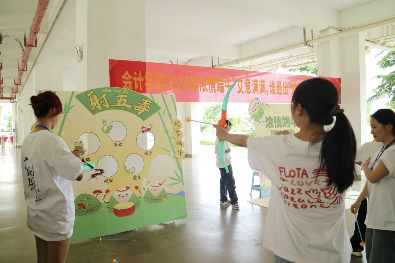 淡淡粽香葉,濃濃世間情。活動前期,會計學(xué)院團委、學(xué)生會的工作人員早早地來到活動場地進行布置,營造出濃厚的節(jié)日氛圍,淡淡的粽香在空氣中彌漫,仿佛預(yù)示著即將到來的精彩活動。本次活動精心設(shè)置了四個游戲項目,分別是一代粽師(射五毒)、福滿龍舟(投壺)、粽有好運(套圈圈)、粽享時光(猜字謎)等,這些游戲不僅充滿了趣味性和挑戰(zhàn)性,更將端午節(jié)的文化元素巧妙地融入其中?;顒蝇F(xiàn)場,眾多同學(xué)們來回穿梭在各個游戲區(qū),在輕松愉快的氛圍中不僅感受到了端午節(jié)的喜慶和歡樂,更在游戲中感受到了傳統(tǒng)文化的魅力。整個活動過程中,同學(xué)們積極參與、熱情高漲,通過游戲互動兌換到自己心儀的獎品,同時,增強了彼此之間的友誼和凝聚力,并深切感受到傳統(tǒng)文化的深厚底蘊。