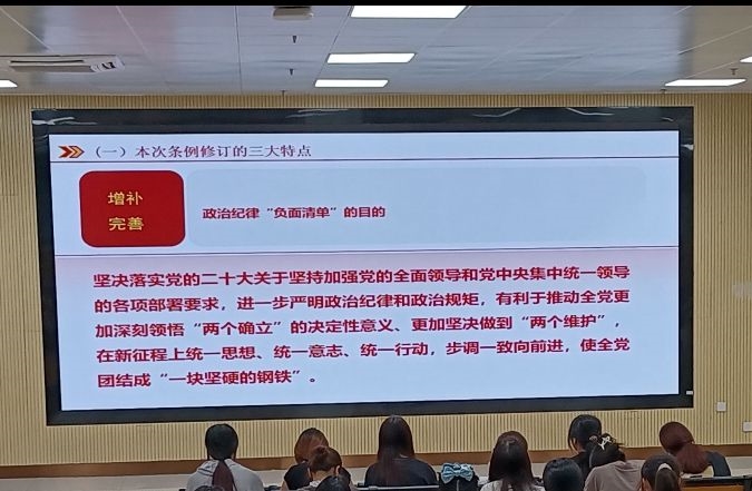 在這堂黨課中,覃老師為我們深入解讀新修訂的《中國(guó)共產(chǎn)黨紀(jì)律處分條例》。該條例作為黨內(nèi)法規(guī)的重要組成部分,對(duì)于加強(qiáng)黨的紀(jì)律建設(shè)、推動(dòng)全面從嚴(yán)治黨具有重要意義。覃老師將從條例的修訂背景、主要內(nèi)容、亮點(diǎn)特色等方面進(jìn)行全面剖析,重點(diǎn)解讀新修訂的《中國(guó)共產(chǎn)黨紀(jì)律處分條例》在強(qiáng)化黨的紀(jì)律建設(shè)、推進(jìn)全面從嚴(yán)治黨方面的新舉措、新要求。同時(shí),結(jié)合實(shí)際案例,分析黨員干部在遵守黨的紀(jì)律、執(zhí)行黨的決定等方面應(yīng)注意的問(wèn)題,引導(dǎo)學(xué)員增強(qiáng)紀(jì)律意識(shí)、規(guī)矩意識(shí),做到守紀(jì)律、講規(guī)矩、有擔(dān)當(dāng)。