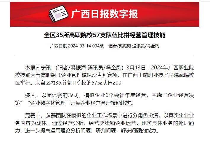 下一條: 【人民網(wǎng)】2024年廣西職業(yè)院校技能大賽高職組《企業(yè)管理模擬沙盤》賽項(xiàng)在廣西工商職業(yè)技術(shù)學(xué)院開賽