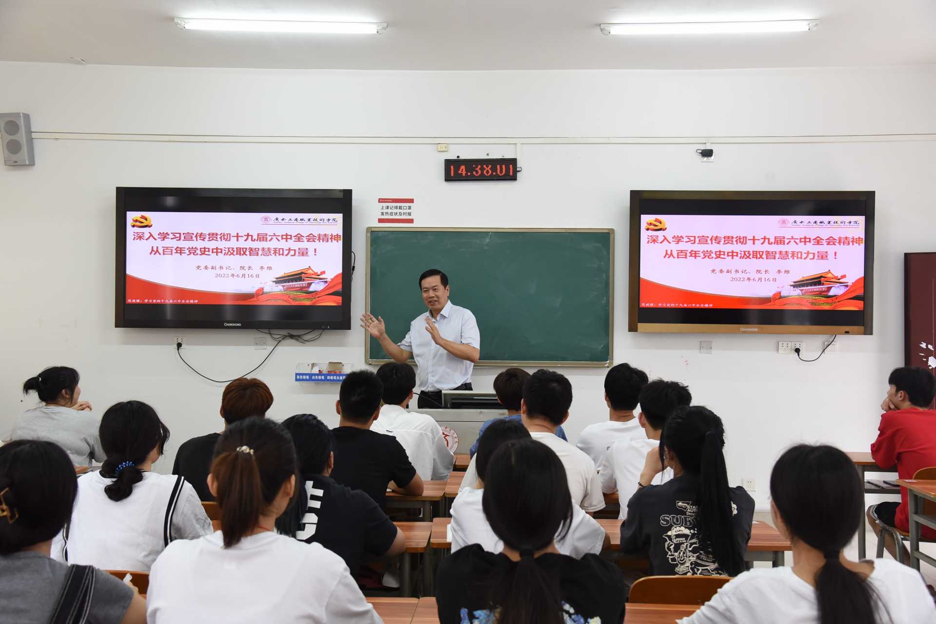 • 6月16日下午,學院黨委副書記、院長李維在鵬飛校區(qū)為21級室內專業(yè)學生講授題為《深入學習宣傳貫徹十九屆六中全會精神——從百年黨史中汲取智慧和力量》的思政課。李維院長從為什么要做這個《決議》——總結黨的百...