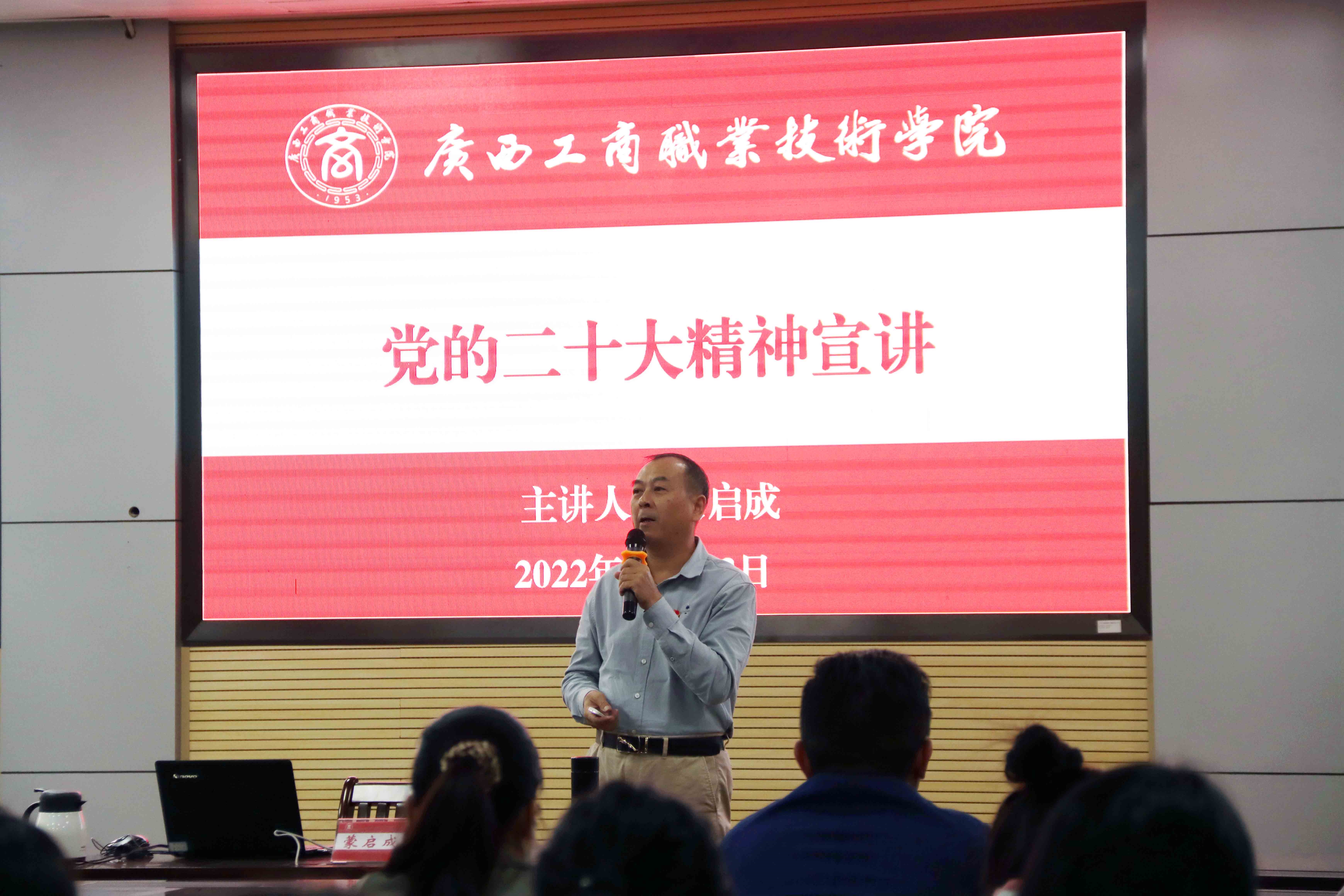 • 2022年11月23日,學院黨委副書記蒙啟成在鵬飛校區(qū)2119會議室為經貿學院師生作黨的二十大精神宣講,經貿學院全體教師及學生代表參加會議,經貿學院黨總支書記王桂玲主持會議。會上,蒙啟成副書記從“關于黨的二十...