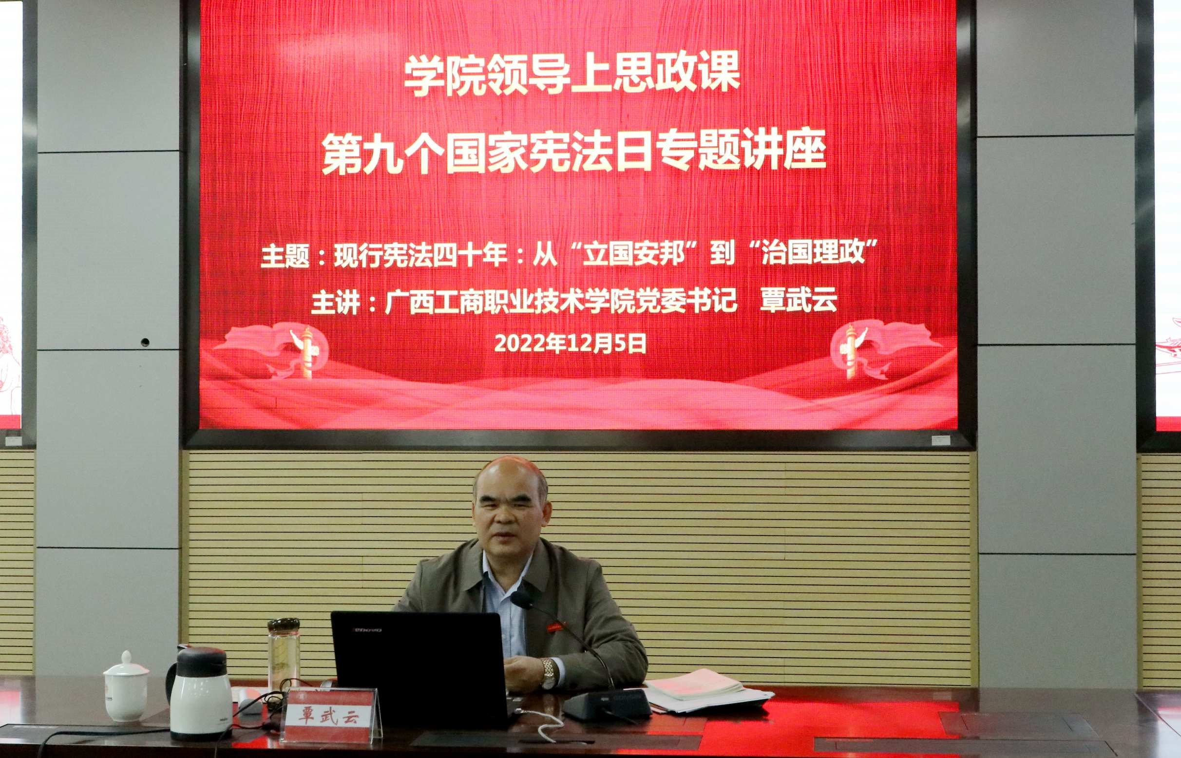 • 2022年12月5日下午,為學(xué)習(xí)宣傳貫徹黨的二十大精神,推動(dòng)全面貫徹實(shí)施憲法,學(xué)院黨委書(shū)記覃武云在學(xué)院報(bào)告廳為學(xué)院廣策2101、廣策2103班全體同學(xué)作了《現(xiàn)行憲法四十年:從“立國(guó)安邦”到“治國(guó)理政”》學(xué)術(shù)專題講...