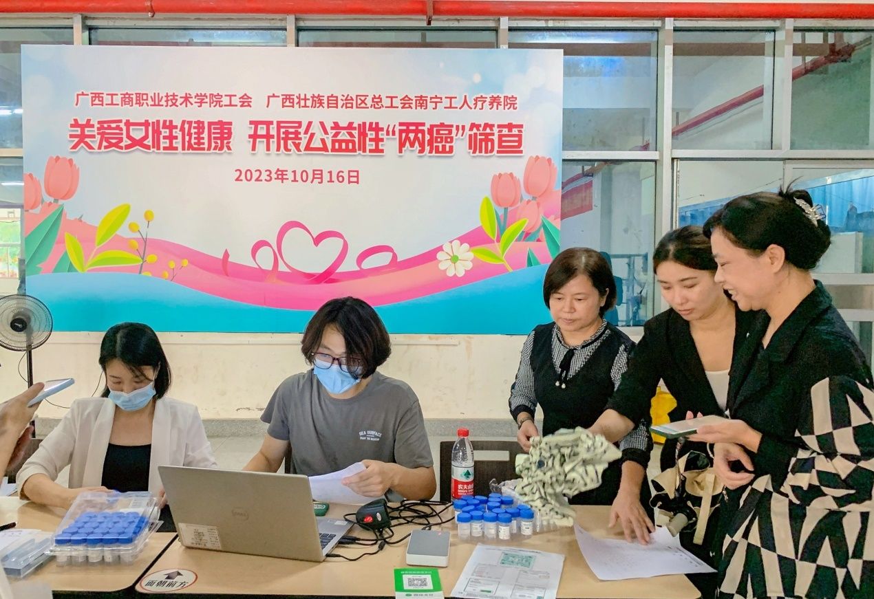 • 10月16日下午,學(xué)院與廣西壯族自治區(qū)總工會(huì)南寧工人療養(yǎng)院在鵬飛校區(qū)開(kāi)展“關(guān)愛(ài)女性健康 開(kāi)展公益性‘兩癌’?篩查”體檢服務(wù),為學(xué)院一線女教職工體檢。(活動(dòng)現(xiàn)場(chǎng))開(kāi)展公益性“兩癌 ”篩查服務(wù)活動(dòng)是自治區(qū)總工...