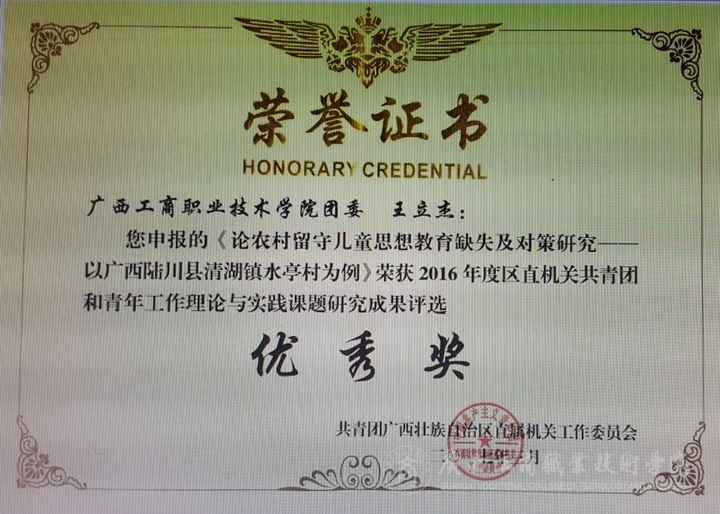 • 2017年3月1日,區(qū)直機關(guān)團工委公布了第二屆區(qū)直機關(guān)共青團和青年工作理論與實踐課題研究成果評比活動獲獎名單。我院王立杰老師的研究課題“論農(nóng)村留守兒童思想教育缺失及對策研究——以廣西陸川縣清湖鎮(zhèn)水亭村為...
