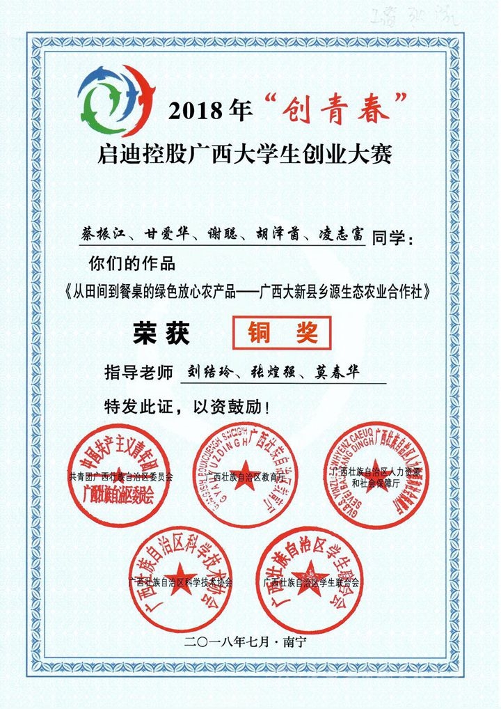 • 近日,共青團(tuán)廣西區(qū)委、自治區(qū)教育廳、自治區(qū)人力資源和社會保障廳、自治區(qū)科協(xié)、廣西學(xué)聯(lián)共同公布了2018年“創(chuàng)青春”啟迪控股廣西大學(xué)生創(chuàng)業(yè)大賽結(jié)果通報(bào),我院蔡振江、李霖、黃體華等多名學(xué)子在2018年“創(chuàng)青春...